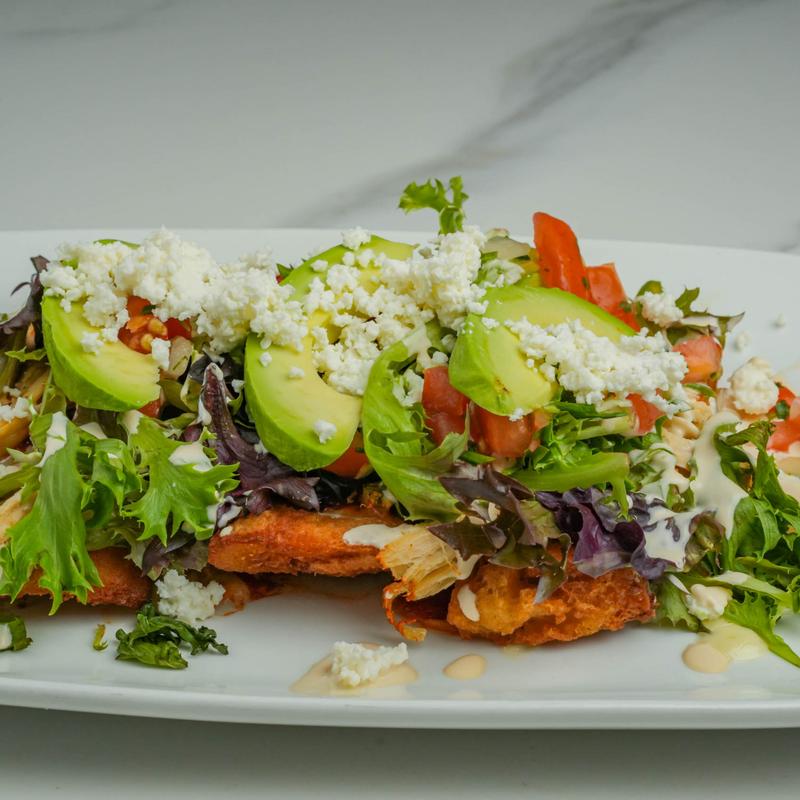 3 lightly fried tamales topped with carnitas, cheese dip, ranchera sauce, lettuce, sour cream, pico de gallo, queso fresco and avocado.