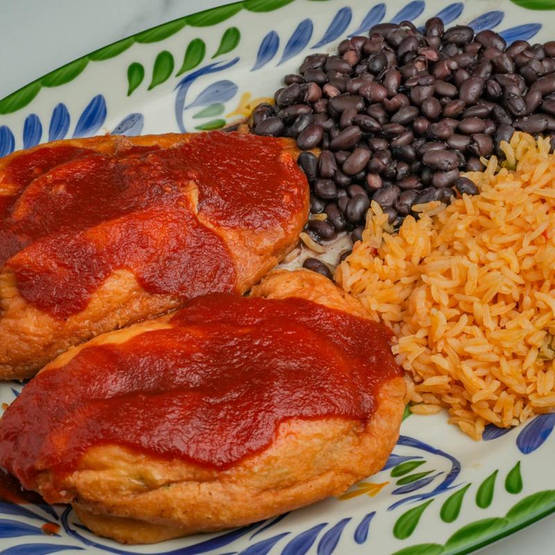 2 authentic poblano peppers, one filled with cheese and one filled with cheese, chicken or beef, served with rice and beans.